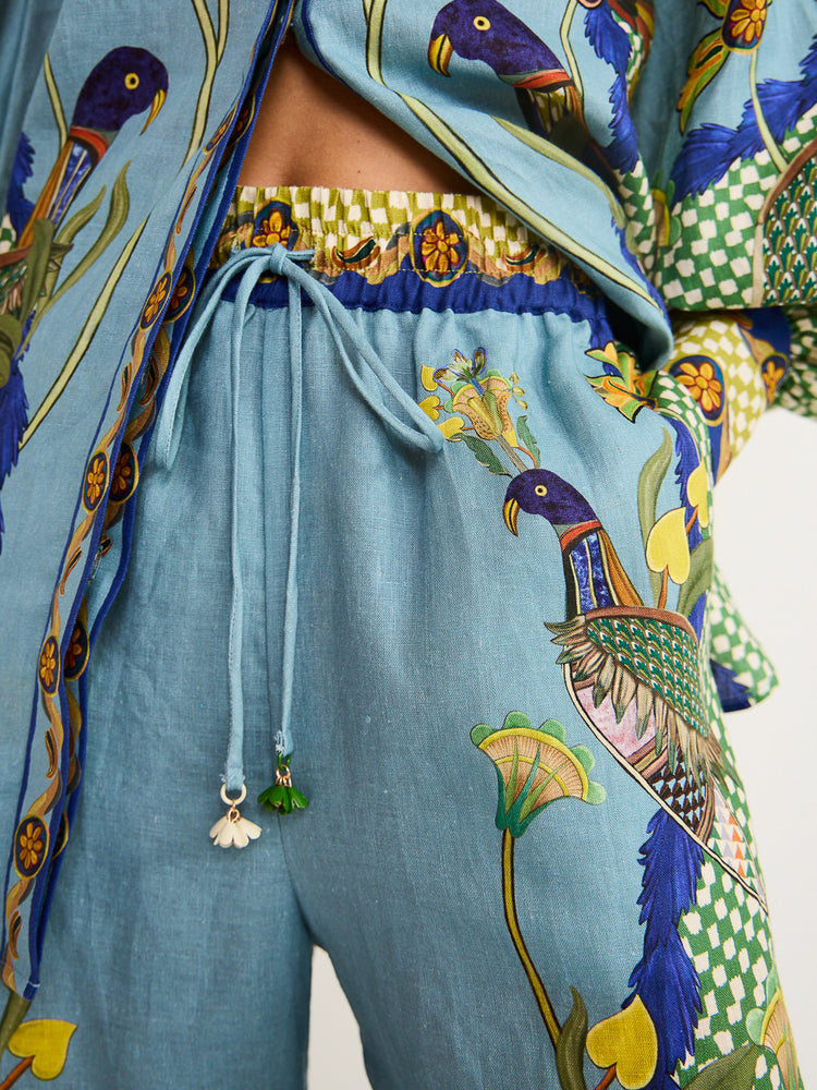 Confeccionado en chalís y algodón, esta pieza es cómoda y agradable al tacto, ya que gracias a su corte holgado, se adapta a cualquier figura. Los pantalones cuentan con una cinturilla elástica y cordón, mientras que la camisa, gracias sus botones; te permitirá vestirla a tu gusto.